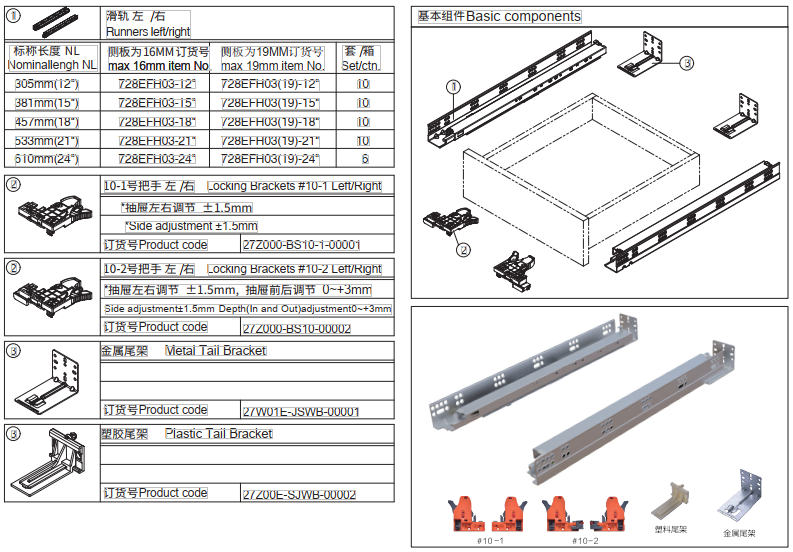 > 齿轮同步,更轻柔,更静音,更顺滑自动关闭系统 > 抽屉可快速安装、拆卸,无需工具 > 抽屉高度调节0~+3mm > 抽屉左右调节±1.5mm > 抽屉前后调节 > 载重40KG