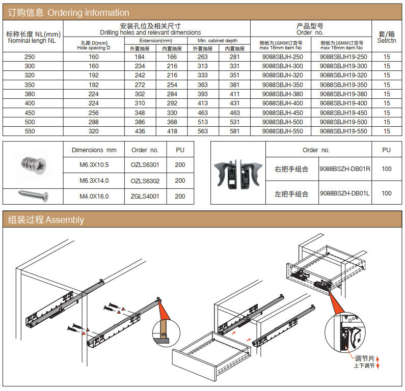 9088SBJH二二节带调节螺丝钢珠隐藏式阻尼滑轨